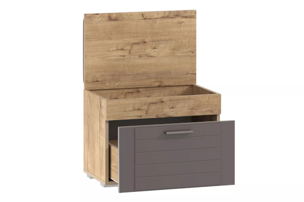 Компактная тумба Livorno НМ 040.63 совмещает в себе функции обувницы и банкетки. Модуль оснащен выдвижным ящиком для размещения в нем повседневной уличной обуви. Под откидной крышкой тумбы скрывается отсек для мелочей. В состав модуля также входит мягкий элемент, который делает процесс сборов комфортным.