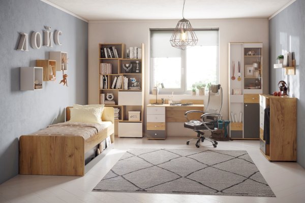 Лаконичная полка с ограничителем дополнит интерьер. Полочки для малыша должны быть размещены не очень высоко, так, чтобы он мог дотянуться до содержимого с невысокого стула или своей кровати. Для подростков же, полки могут располагаться на любой высоте, в соответствии с желанием хозяина комнаты.