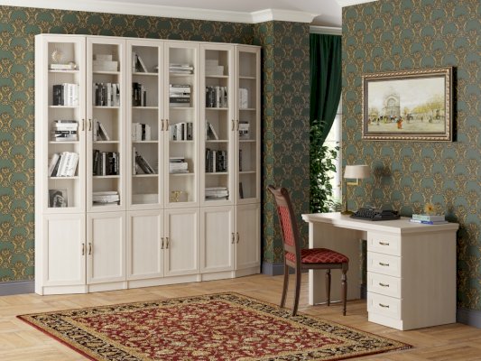 Шкаф В-19- двухстворчатый шкаф с распашными фасадами. Шкаф имеет наибольшую ширину из всех библиотечных модулей, он вместительный и функциональный. Нижние фасады глухие, они позволяют хранить те вещи, которые нужно спрятать от посторонних глаз. Верхние фасады со стеклянными вставками, они позволят сделать просматриваемыми предметы, которые радуют глаз, будь то посуда или книги. Прочные полки из ЛДСП выдерживают вес до 5 кг. Полки выполнены в цвет корпуса шкафа. Фасады крепятся на металлические петли без доводчиков.