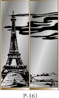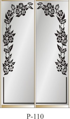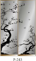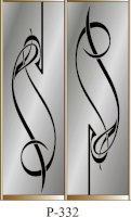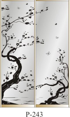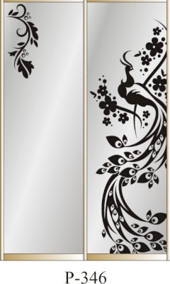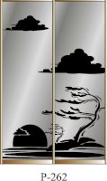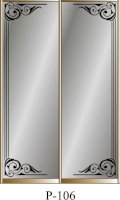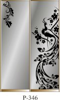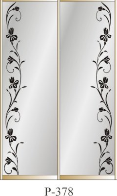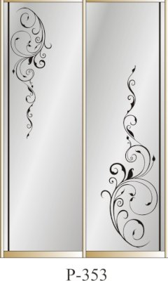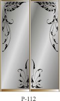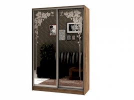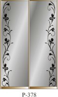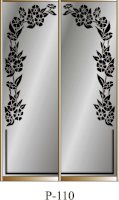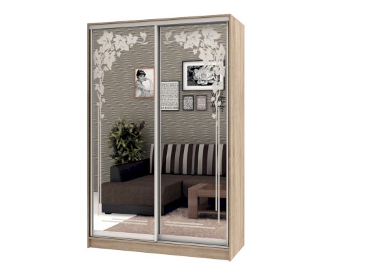 корпус - Дуб Сонома, фасады - зеркало с пескоструйным рисунком, рамка двери и треки - Серебро матовое.