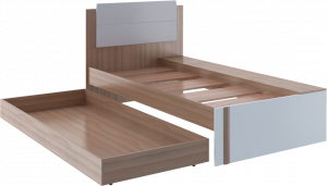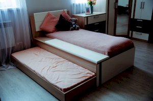 • Кровать оборудована столешницей, состоящей из стационарной части, которую можно использовать как мини-столик, и подъемной панели под которой скрыто место для хранения.