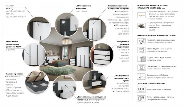 Мишель – это современная спальня с лаконичными формами и строгой геометрией в актуальных природных цветах. Оригинальная конструкция основания в сочетании со светодиодной подсветкой создают «эффект парения». Накладные светильники в комбинированном изголовье дают дополнительное освещение в ночное время, а мягкая накладка с вертикальной отстрочкой поддержит спину во время отдыха. Отсутствие лицевой фурнитуры в ящиках и комодах подчеркивают минималистичный дизайн спальни, а контрастные ручки шкафов оттеняют белизну фасадов.