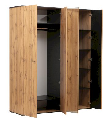 Самый большой и вместительный модуль во всей линейке шкафов! Шкаф – четырехдверный, слева, за двумя распашными дверцами – отделение для одежды на вешалках, справа – за двумя дверцами – полки. Высота шкафа позволяет разместить на вешалках даже очень длинную одежду – например, платья «макси». Сверху и снизу находятся полки. Наверх можно убрать то, чем вы пользуетесь нечасто, а вниз – коробки с обувью. Металлическая штанга выдерживает вес до 20 кг, каждая из полок – до 5 кг. Справа – тоже за двумя дверцами – зеркальной и с реечным фасадом – спрятались полки. Они широкие и глубокие – поместится все!