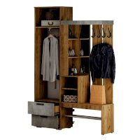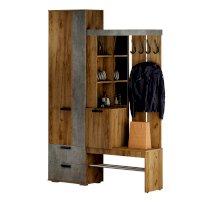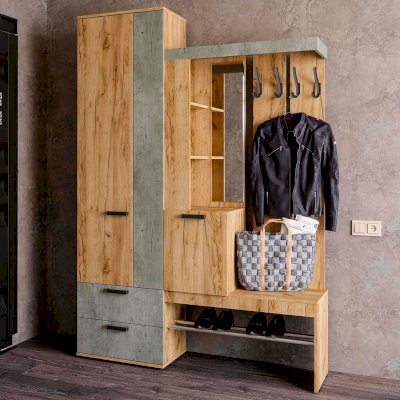 Идеальный выбор для современного интерьера, особенно в стиле лофт, – это прихожая Трамп. Модель выполнена из ЛДСП двух цветов – крафт и бетон. Изделие имеет все необходимые зоны для размещения вещей в прихожей: крючки для верхней одежды, открытые и закрытые ниши, шкаф с выдвижной штангой и зону для хранения обуви.