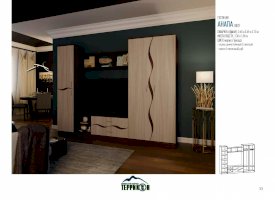 Гостиная «Анапа» — это неброская, изящная модель. Главным ее украшением служит отделка натуральных цветов с достоверной имитацией фактуры благородных сортов древесины. Плавно изогнутые линии на фасаде создают ощущение мягкости и возвышенности. В комплект входят два вместительных шкафа, открытые полочки, тумба. В центральной части гарнитура отведено место под телевизор.