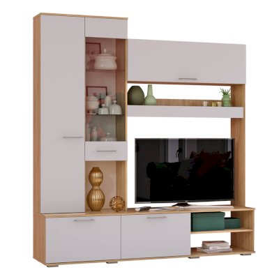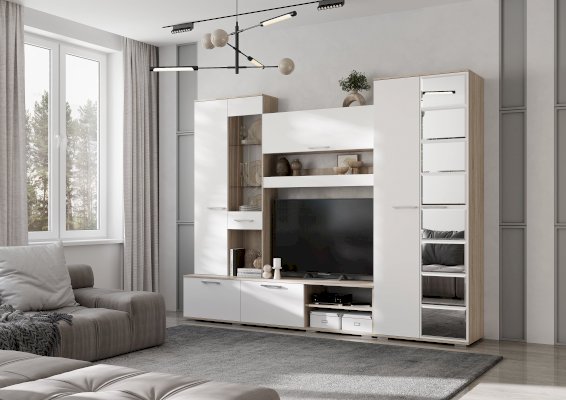 Гостиная Флай идеально подчеркнет сдержанный интерьер, при этом добавит лоска за счёт фасадов из матового ЛДСП белого цвета. В данной модели вы сможете разместить не только телевизор, но и различные мелочи, документы, сувениры или книги. Нестандартное расположение открытых полок придает гостиной Флай невесомости и делает ее очень стильной.