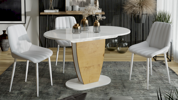 Столешница изготовлена из ЛДСП 16 мм и осветленного закаленного глянцевого стекла 4 мм, вставка выполнена из ЛДСП 22 мм. Модель имеет оригинальную скругленную форму опоры с белыми глянцевыми элементами из МДФ 4 мм по бокам. Плавные линии и креативное решение со вставками добавят кухне ноток оригинальности и эксцентричности. Основание изготовлено из МДФ 22 мм.