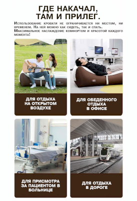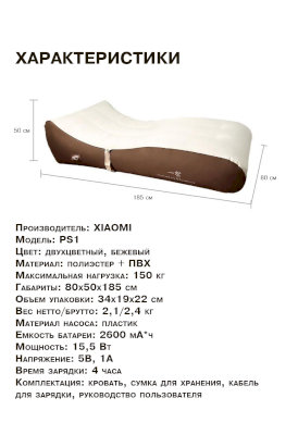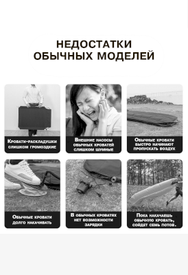 Комплектация: кровать надувная, сумка для хранения, кабель для зарядки, руководство пользователя.
