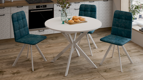 Круглый обеденный стол на перекрещенных ножках смотрится изящно, лаконично и ненавязчиво в любом интерьере. Столешница выполнена из ЛДСП 22 мм. Яркая особенность новинки — это опоры из металла, которые смотрятся привлекательно и стильно. Ножки окрашены порошковой краской в цвета «Белый муар» и «Черный муар».