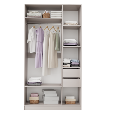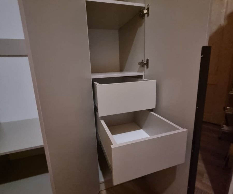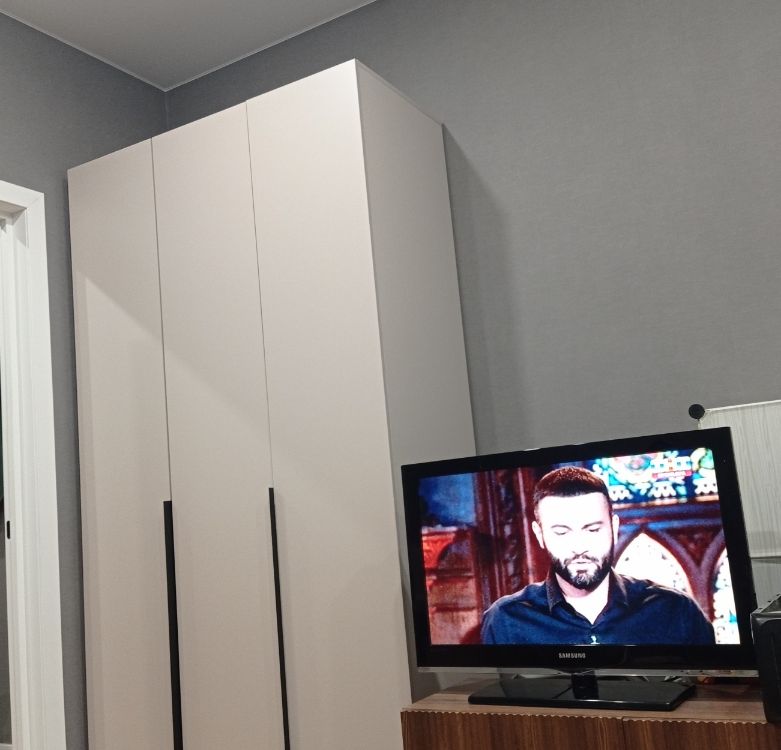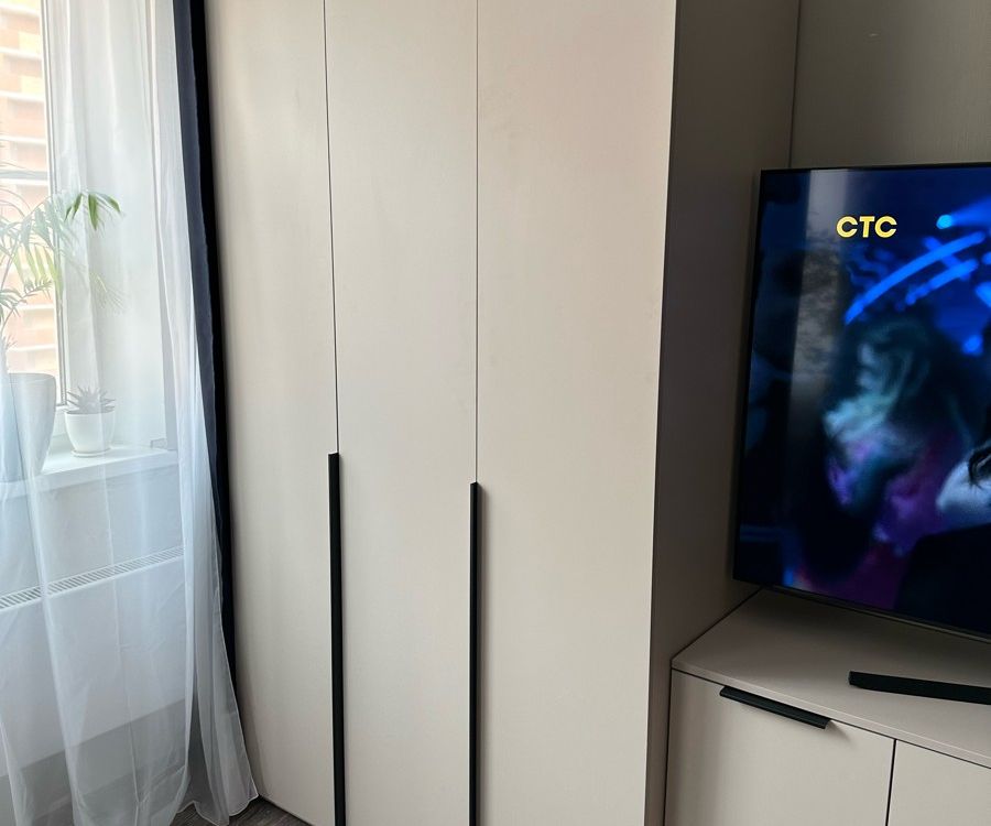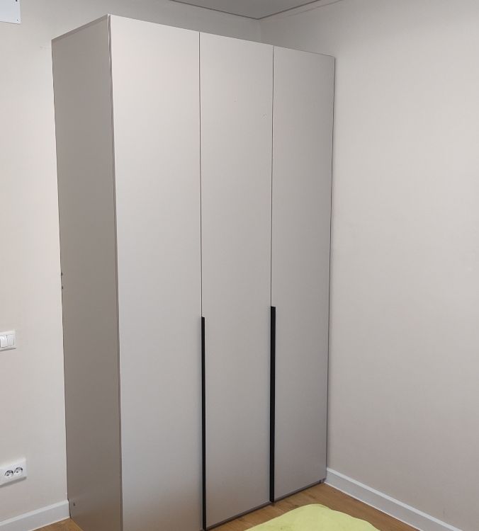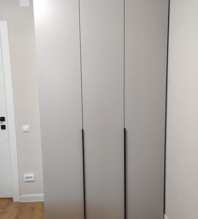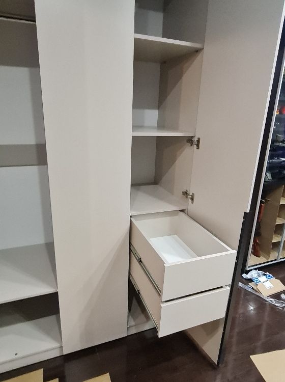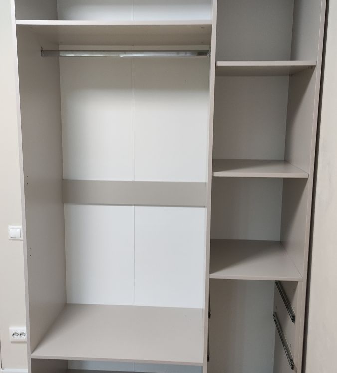 Шкаф простой, минималистичный, но смотрится стильно и красиво, для маленькой комнаты самое то, цвет тёплый бежево-серый красивый, подошёл под интерьер. Качество хорошее, собрал мастер, все детали идеально подошли друг к другу, крупных косяков нет, небольшая трещина на полке дна, не критично. Дверцы с доводчиками, ящички открываются тоже плавно. Дешево и сердито!) Очень приятный на ощупь) Кромка отличная!