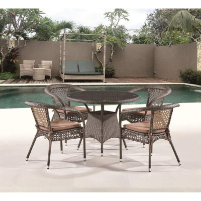 Обеденный комплект плетеной мебели предоставит отличное место для отдыха всей семьи. Столешница из ударопрочного и безопасного закаленного стекла. Кресла с мягкими подушками и подлокотниками делают комплект более комфортным и удобным.