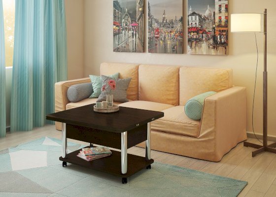 • Функциональность. Купив стол-трансформер потребитель получает сразу два изделия: небольшой журнальный столик и полноценный обеденный стол на 6–8 человек.