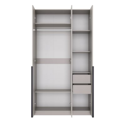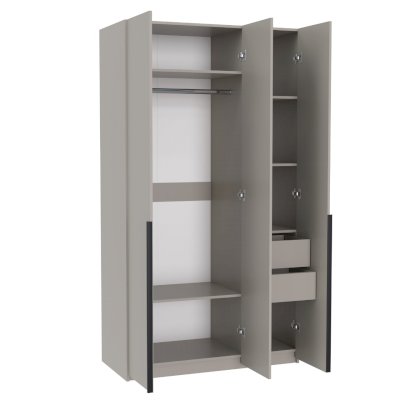 Распашной шкаф имеет 3 дверцы с длинными профильными ручками. За правой дверью расположено 2 выдвижных ящика и 3 полки для хранения. За двумя правыми дверками – 1 антресольная полка, платяной отсек с горизонтальной штангой и место для хранения снизу. Комбинированная модель позволяет использовать её сразу в качестве плательного и бельевого шкафа, где можно разместить гардероб, верхнюю и обычную одежду, белье и другие вещи.