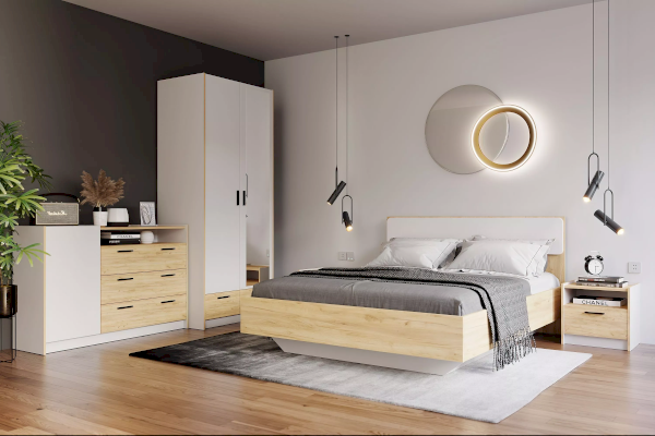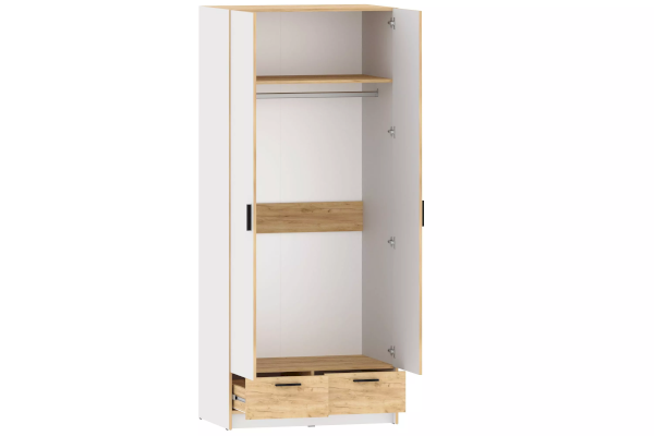 Шкаф оснащен двумя выдвижными ящиками для вещей, которые плавно и бесшумно скользят за счет шариковых направляющих, а также овальной штангой для хранения одежды на вешалках. Шкаф можно дополнить другими модульными шкафами из одноименной коллекции.