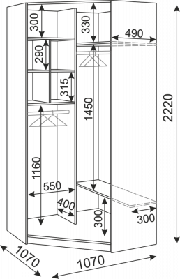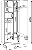 • Внутри два вешела: под длинную и короткую одежду и пять полок (средняя в секции слева и нижняя справа - съемные).