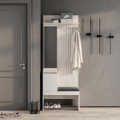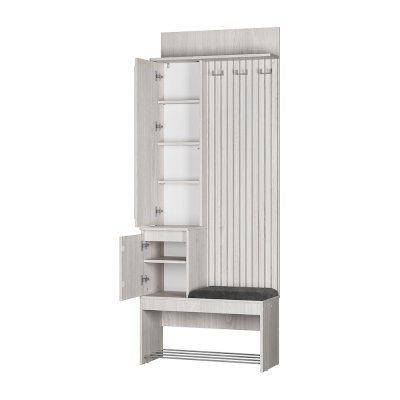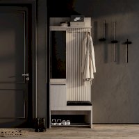 Функционал прихожей «Лама» продуман до мелочей. В данной модели предусмотрены все необходимые зоны. Удобные крючки позволяют разместить повседневную одежду, не занимая при этом лишнего пространства. Горизонтальная зона из металлических труб предназначена для хранения обуви.