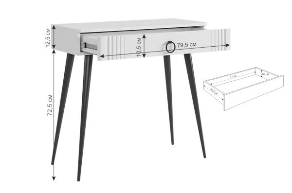 Туалетный столик 2 "Ева" – это элегантное и функциональное решение для вашей спальни. Шариковые направляющие на ящике обеспечивают плавное открывание и закрывание. Устойчивые черные опоры добавляют стиля столику.