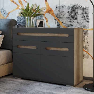 Неглубокая тумба Наоми может использоваться в любой комнате вашей квартиры или дома. Модель оснащена одним выдвижным ящиком и двумя распашными дверцами, за которыми находятся полки для хранения. Изделие имеет характерную для коллекции Наоми отделку: корпус выполнен из ЛДСП в цвете дуб каньон, фасады имеют интегрированные ручки.
