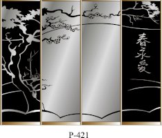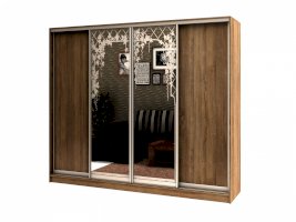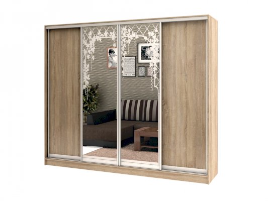 корпус - Дуб Сонома, фасады - Дуб Сонома (2 шт.) и зеркало с пескоструйным рисунком (2 шт.), рамка двери и треки - Серебро матовое.