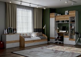 Сверху антресоль, открывается вверх на газлифте. Три открытые полки в цвете делано светлый. Внизу два ящика (один большой, второй маленький (по ширине цветной вставки, без ручки). Направляющие НПВ шариковые.