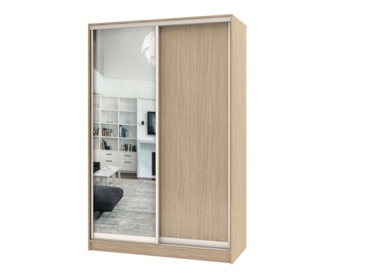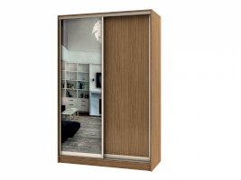 Данное изображение представлено в следующих цветах: корпус - Дуб Феррара, фасады - Дуб Феррара (1 шт.) и зеркало (1 шт.), рамка двери и треки - Серебро матовое.