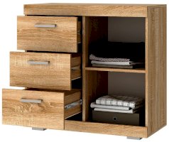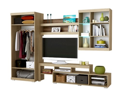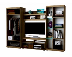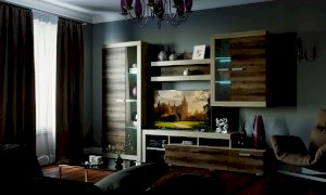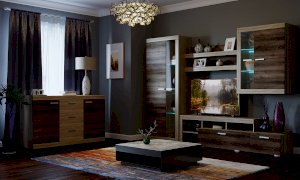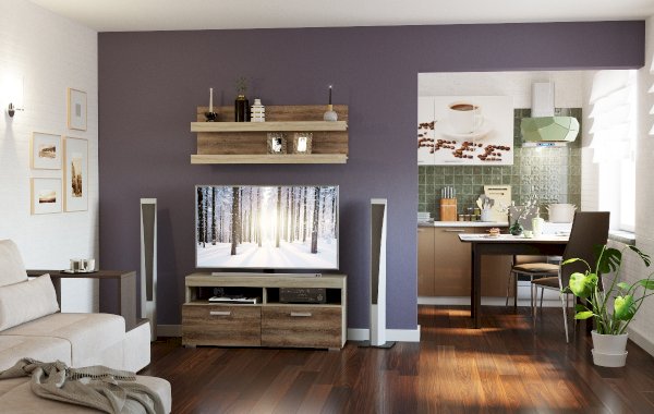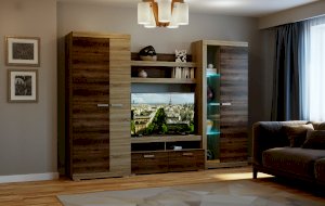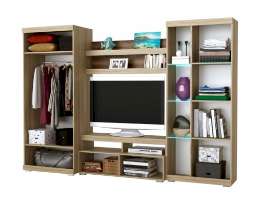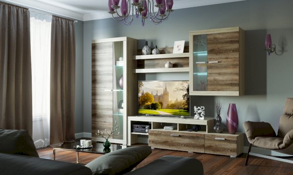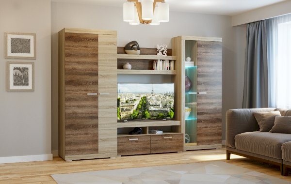 В гостиной Соната применяются современные европейские декоры: корпус выполнен из ЛДСП Дуб сонома, фасад из ЛДСП Дуб Сакраменто. Декоры отличаются выраженной тёплой древесной текстурой, а фасадная часть подчёркнута горизонтальными линиями текстуры и стильными планками МДФ, представляющими собой элементы корпуса и фасада.