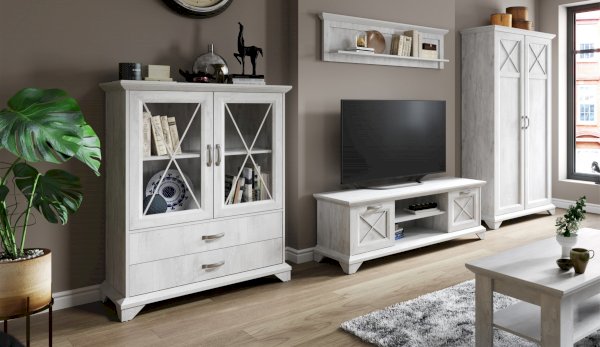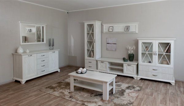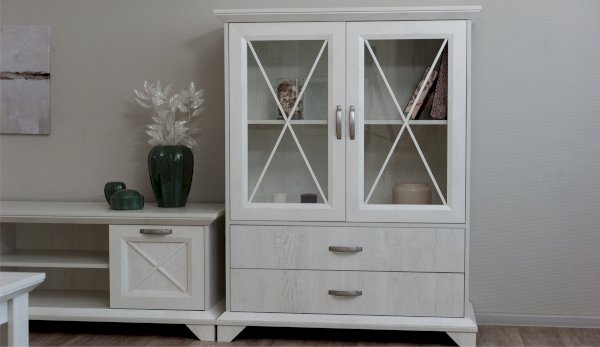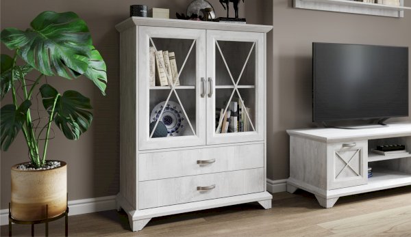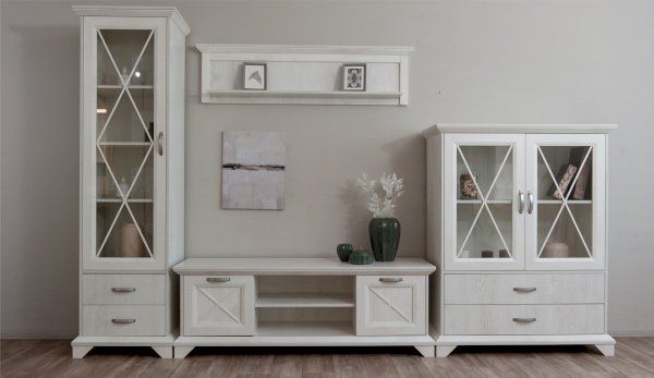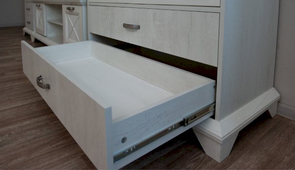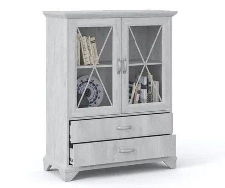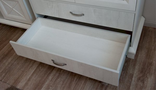 Вместительный комод Лорена в стиле неоклассика создает уютную атмосферу в интерьере гостиной или спальни. Белые фасады с фактурой и рисунком натурального дерева наполняют комнату светом, делают ее просторнее. Металлические ручки цвета состаренного серебра придают изысканность, а фигурные ножки и декоративный карниз подчеркивают стилистику коллекции. За прозрачными витринами будут идеально смотреться красивая посуда, антикварный декор и сувениры. В выдвижных ящиках на телескопических направляющих удобно хранить текстиль, посуду. Выполнен из экологичных материалов.