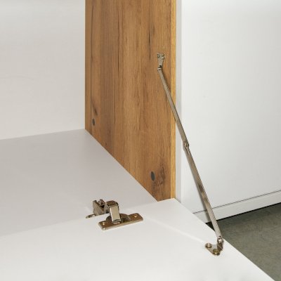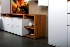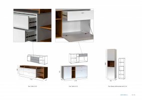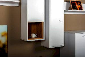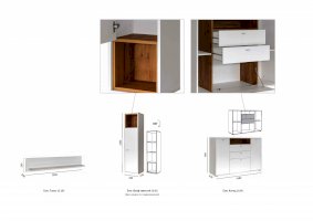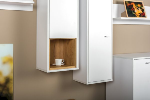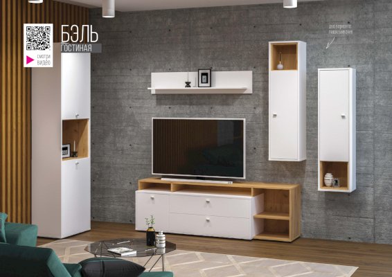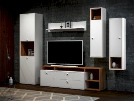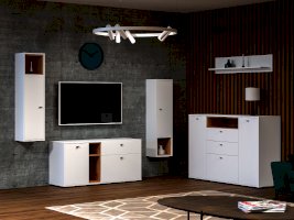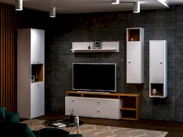 Дуб вотан/Белый премиум Гостиная модульная система сочетает в себе актуальные цвета и функциональную геометрическую форму с мотивами конструктивизма.