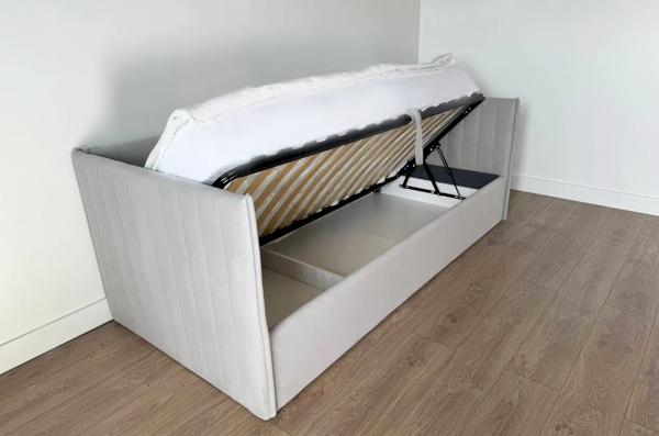 Подъемный механизм позволяет легко скрыть под матрасом дополнительное пространство для хранения вещей — идеально для хранения постельного белья, игрушек или сезонной одежды.