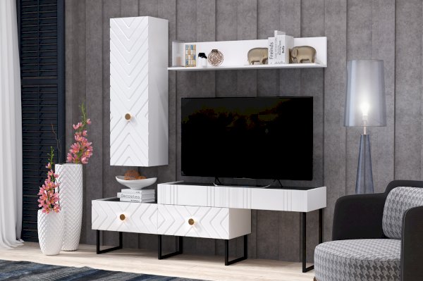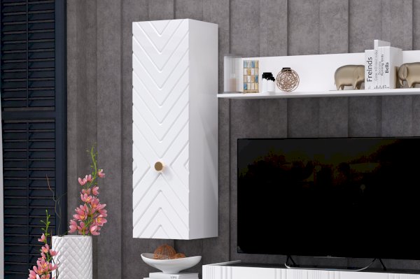 Изделие выполнено из ЛДСП в сочетании с фасадами МДФ в глянцевой пленке ПВХ. Рисунок фрезерованных фасадов в виде синхронных четких линий придает мебели ультрасовременный вид. Лаконичная ручка серьга акцентирует внимание и дополняет декор фасада. Внутреннее наполнение представлено двумя полками ЛДСП.