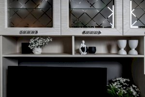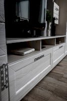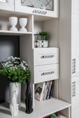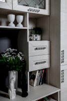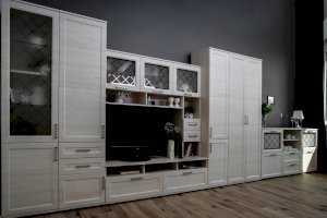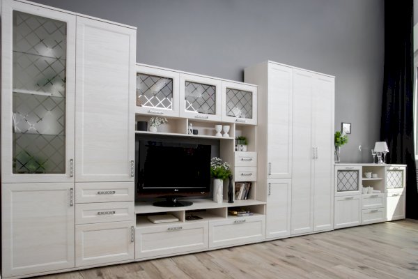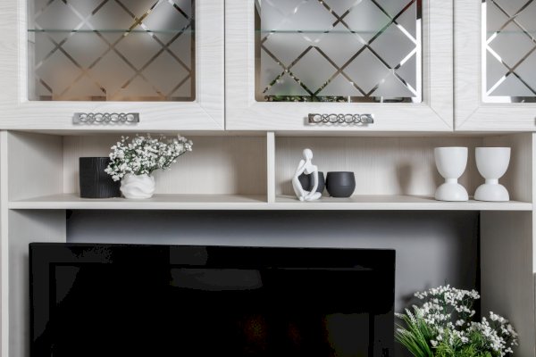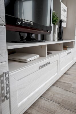 Помимо привлекательного дизайна, тумба под ТВ может похвастаться отличной функциональностью. Она имеет два вместительных ящика и два маленьких, открытые ниши под тв аппаратуру и полки под декор. Дверки со стеклом с пескоструйным рисунком добавляют модели легкость. Таким образом, тумба под ТВ при достаточно компактных размерах имеет множество мест для хранения. Это идеальный вариант для небольших гостиных.