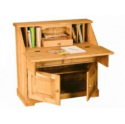 Комбинированная конструкция классического типа. Имеет откидную панель. За ней находятся открытые отсеки и выдвижной ящик. В нижней части секретера расположено просторное отделение с полкой и распашными дверями, а также два ящика.