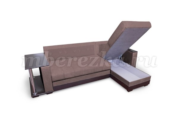 Данная модель дивана, с механизмом «дельфин» и большой бельевой нишей, сочетает функции дивана, кровати и журнального столика. При помощи механизма диван легко раскладывается, образуя ровное спальное место. Основой каркаса выступают фанера и брус кроватный, что свидетельствует о прочности и влагостойкости дивана. Стальные пружинные змейки придают дивану упругость и ортопедический эффект.