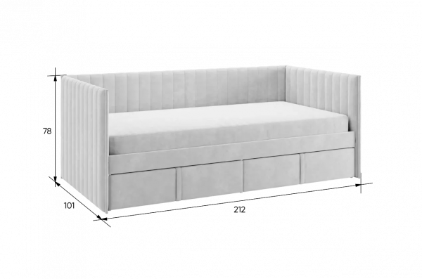Кровать с ящиками Твикс (Софа) 90х200 см – это идеальное решение для компактного и функционального обустройства спальни или детской комнаты. Изготовленная из высококачественных материалов, таких как ДСП толщиной 16 мм, мягкого наполнителя и велюра, она сочетает в себе современный дизайн и практичность.