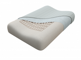 Подушка средней жесткости из материала с «эффектом памяти», имеет эргономическую форму, с двумя валиками под шею одинаковой высоты и углублением в центре, которое покрыто мягкими округлыми конусами для создания эффекта микромассажа во время сна. Благодаря этому эффекту улучшается кровоснабжение тканей и ускоряется обменные процессы, что в свою очередь замедляет процесс старения тканей и кожа лица становится более упругой и здоровой.