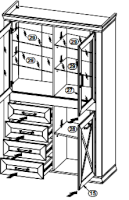 Верхняя часть конструкции – отделение со стеклянными полками, закрывающееся частично застекленными распашными дверцами.