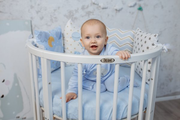 - Овальная кроватка. Длину кроватки можно корректировать относительно роста ребенка. Это сделает покупку долговечной и избавит от необходимости покупать малышу новую кровать как минимум на пять лет вперед. Размеры овальной кроватки 78*128 см. Для овальной кроватки вы можете приобрести дополнительно овальный матрас