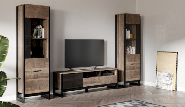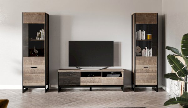 Шкаф-витрина со стеклянным фасадом – современное решение для гостиной или прихожей в стилях лофт, сканди, эко-минимализм. За стеклом размещены полки для предметов интерьера или красивой посуды. Нижнее отделение с глухим фасадом служит для хранения личных вещей. Отсутствие лицевой фурнитуры подчеркивает минимализм и геометрию модуля. Особенность дизайна – это сочетание реалистичных по цвету и тактильности трендовых декоров, которые соответствуют последним городским тенденциям. «Дуб Гранж» привлекает имитацией вручную обработанного дерева и выразительной зернистой текстурой, характерной формой досок. Стильный серый цвет «Железного камня» с металлическими разводами и новая текстура состаренной штукатурки в сочетании с гладкостью металла вносят индустриальныи? колорит. Оригинальные ножки-опоры из МДФ контрастного цвета придают изюминку, а светодиодная подсветка усилит впечатление от созданного интерьера.