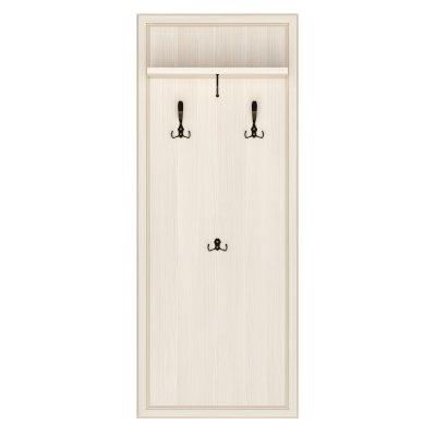 Конструкция вешалки включает 2 ряда крючков: верхние трехрожковые и нижний двухрожковый крючки. Удобная полочка создана для головных уборов и аксессуаров, а под ней закреплена небольшая штанга для одежды на вешалках.
