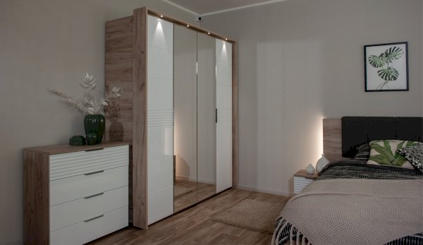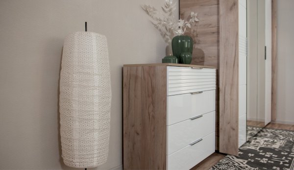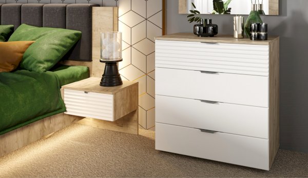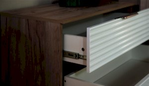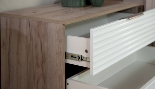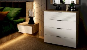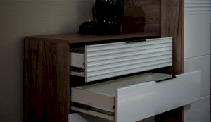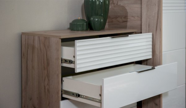 Комод Джулия представитель европейского стиля минимализм. Декором белым глянцевым фасадам High Gloss служит фрезерованный рисунок «Волна» - подчеркивает зеркальный блеск, делает интерьер спальни особенным и неповторимым. Торцевые ручки из хромированного металла - яркий акцент фасадов. Он подойдет для детских и спален, для хранения белья и одежды. В спальне - легко превращается в туалетный столик, достаточно повесить над ним зеркало. Комод выполнен из экологически безопасных надежных материалов, ящики на телескопических направляющих. Идеально компонуется со всеми модулями спальни Джулия.