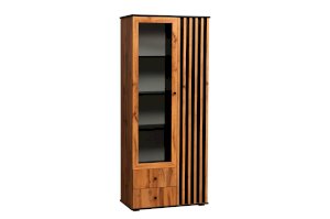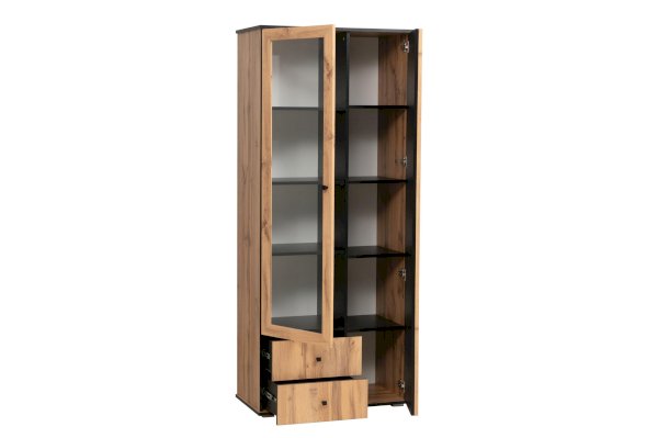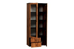 Комбинированный шкаф удачно сочетает в себе витрину, стеллаж и комод. Шкаф визуально разделен на две части. Левая – за стеклянной дверцей, которая обрамлена рамкой в цвет дерева. Правая часть – закрытая. Внутри, за дверцами, находятся полки из ЛДСП. Каждая выдерживает вес до 5 кг. За каждой дверцей – по 4 полки. Они разной ширины, так как левая часть, по традиции коллекции, шире, а правая – уже.