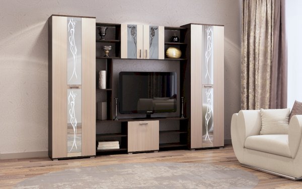 Гостиная "Прага" - это классическая среднегабаритная зальная стенка. В гостиной «Прага» применяются современные декоры, а фасадная часть украшена зеркалами и стеклами с пескоструйным рисунком. Все элементы гостиной устанавливаются на регулируемые ножки-опоры.