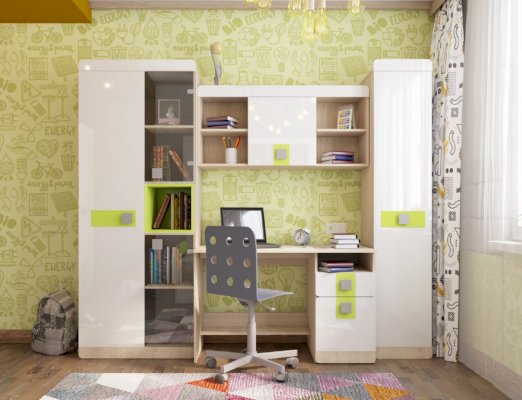 Мебель для детей «Стиль», выполненная в цвете «Лайм» подойдет как для младших, так и для старших школьников. Корпуса детской «Стиль» выполнены из ЛДСП толщиной 16 и 22 мм. Торцы обработаны кромкой ПВХ. Фасады выполнены из плиты МДФ, покрытых глянцевой пленкой белого цвета. Декоративные элементы на фасадах выполнены из МДФ с глянцевой пленкой ПВХ, по периметру подчеркнуты фрезеровкой. Все петли на фасадах с доводчиками. Направляющие на выкатных ящиках - шариковые, полного выдвижения. Мякгие элементы, скругленные углы, пластиковые ручки - все служит безопасности ребенка и придаёт эстетичный внешний вид.