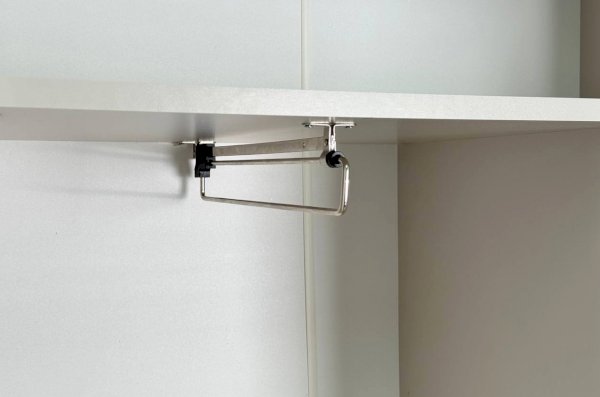 Шкаф оснащён надёжными металлическими ручками и имеет удобное внутреннее наполнение: справа расположены полки, а слева — штанга для вешалок. Это позволяет рационально использовать пространство и разместить различные типы одежды.