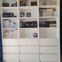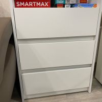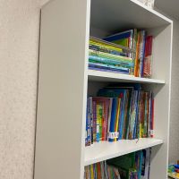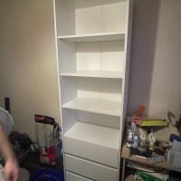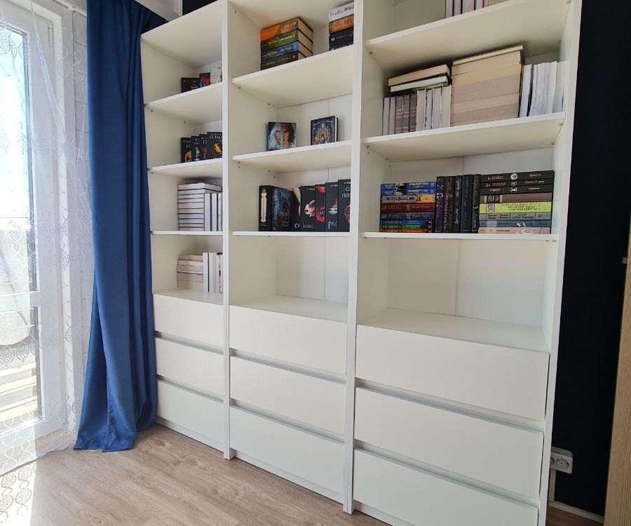 лаконичный, белый, с ящиками, высокий и глубокий, удобен для хранения и расстановки книг плюс хранение других вещей в комнате. прост в сборке - собирается за час максимум