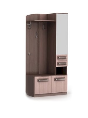Отличительные особенности прихожей — функциональный дизайн и современные оттенки текстур. Конструкция данной модели включает в себя все необходимое: зеркало, шкаф, пенал, вешалки, ящики и множество полок для различных мелочей.