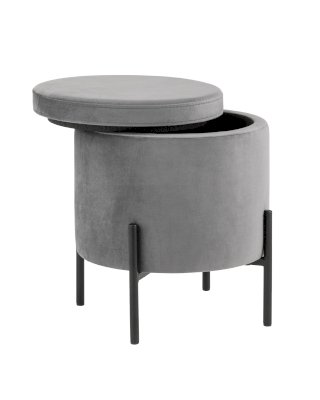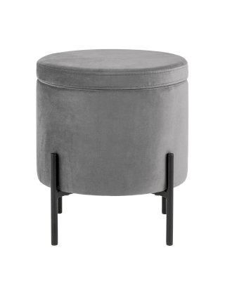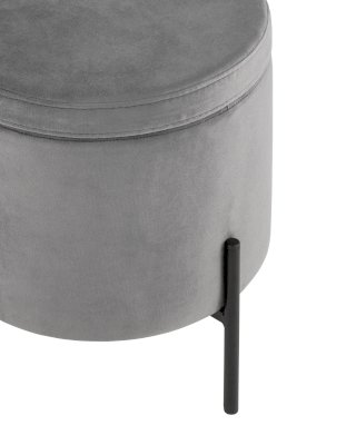Лаконичный круглый пуф на металлических ножках. Мягкая обивка выполнена из износостойкого велюра, тактильно приятный и долговечный материал. Металлические ножки черного цвета высотой 13 см. выдерживают нагрузку до 80 кг. Подпятники в основании ножек делают пуф более устойчивым и предотвращают скольжение. Под сидением имеется ящик для хранения мелочей, крышка полностью съемная. Пуфик станет отличным дополнением для спальни, прихожей или зала.