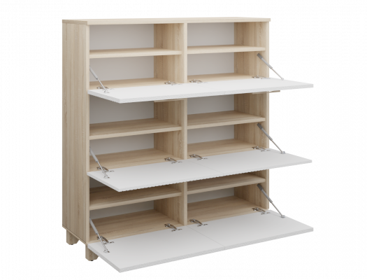 Вместительная обувница Копенгаген — это функциональное решение для прихожей. Модель оборудована шестью откидными ящиками для хранения большого количества обуви. Конструкцией предусмотрены петли с доводчиками для плавности хода створок. Ручки из натурального массива дуба добавят удобства в использовании обувницы. Опоры изделия изготовлены из массива сосны и регулируются по высоте, что позволяет нивелировать неровности поверхности.