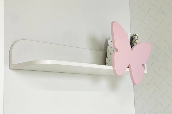 Изготовлена полка из качественных материалов: корпус из лдсп белого дерева придаст интерьеру легкость и свежесть, а декоративный элемент в виде бабочки из мдф розового цвета, эмаль внесет нотку игривости и нежности.