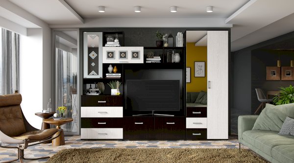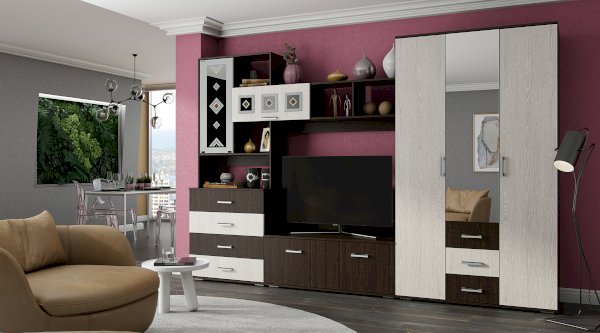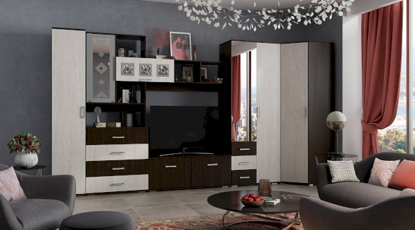 Модульная гостиная Белла - это функциональная стилизованная модель с простыми геометрическими формами. Особый шарм ей придаёт сочетание корпуса и фасада, а также отделка зеркалами бронзового оттенка с фьюзингом (художественные вставки из цветного стекла), пескоструйной обработкой и еврокромкой. Удобная зона для ТВ, вместительные выдвижные ящики, закрытые и открытые полки позволяют максимально эффективно использовать пространство.